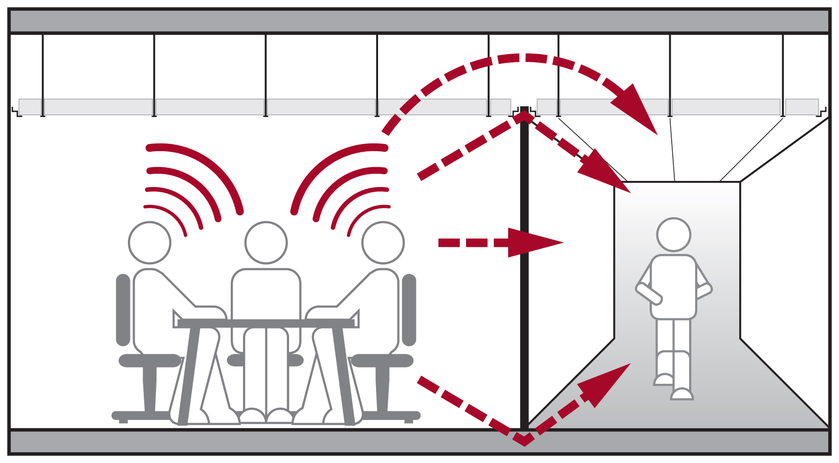 مزاحمترین نوفه معمولاً از سقف به سمت پایین بخش میشود و موثرترین روش جذب صوت سقف استفاده از صفحات آکوستیک یا سقف کاذب و نصب یک لایه جاذب صدا بین آنهاست.